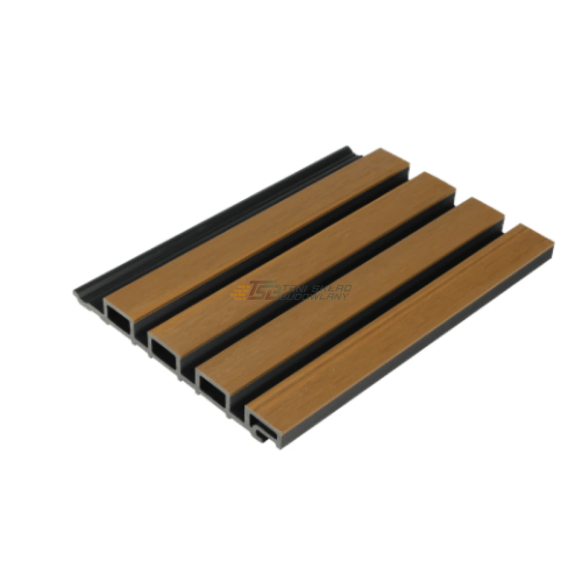 Lamele elewacyjne kompozytowe kolor Teak - Złoty Dąb, na czarnym tle.