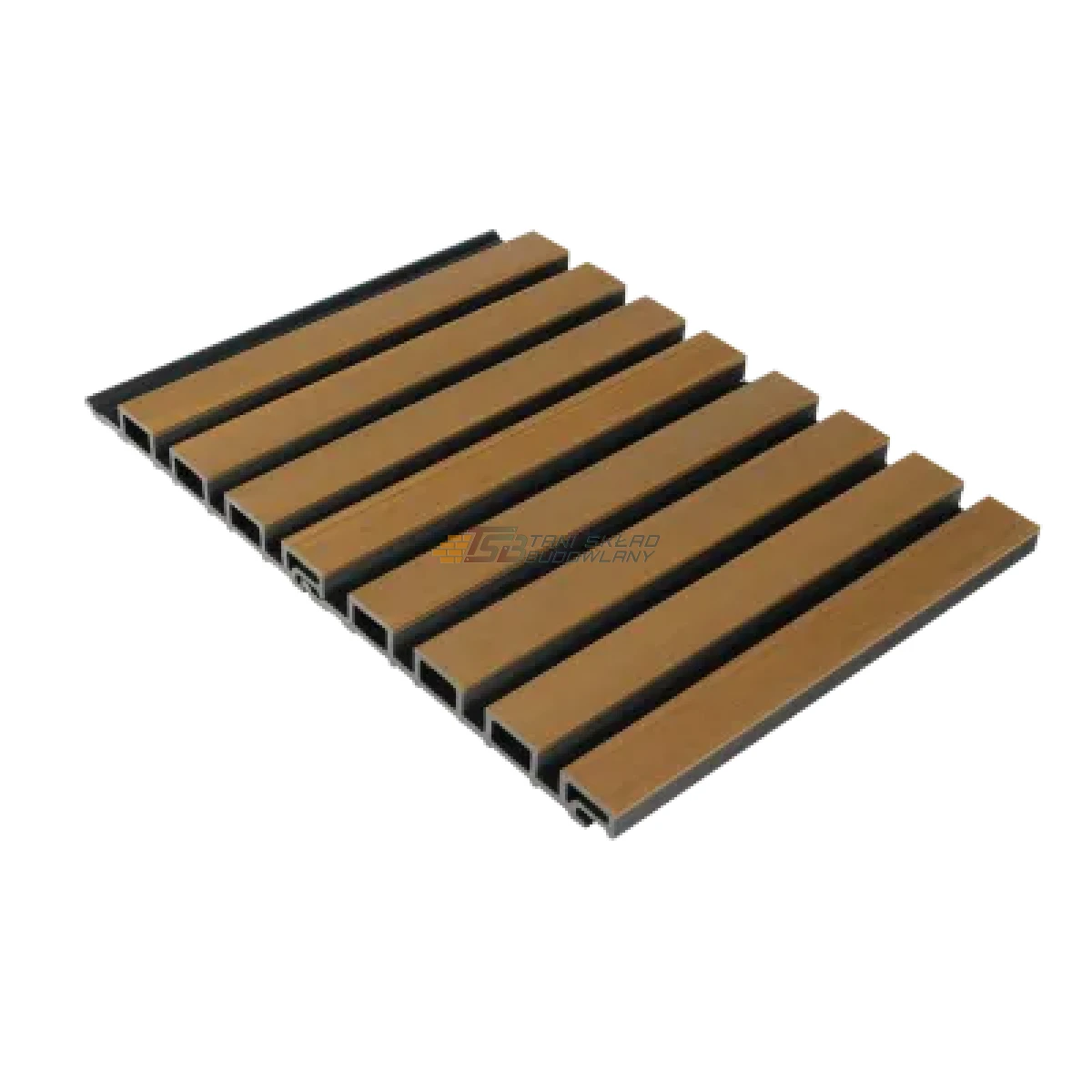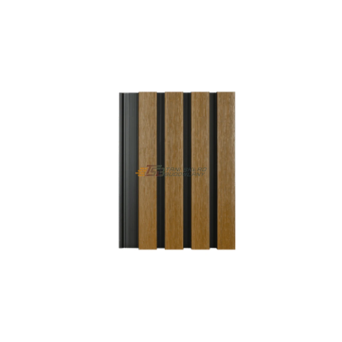 Lamele elewacyjne kompozytowe kolor Teak - Złoty Dąb, na czarnym tle.