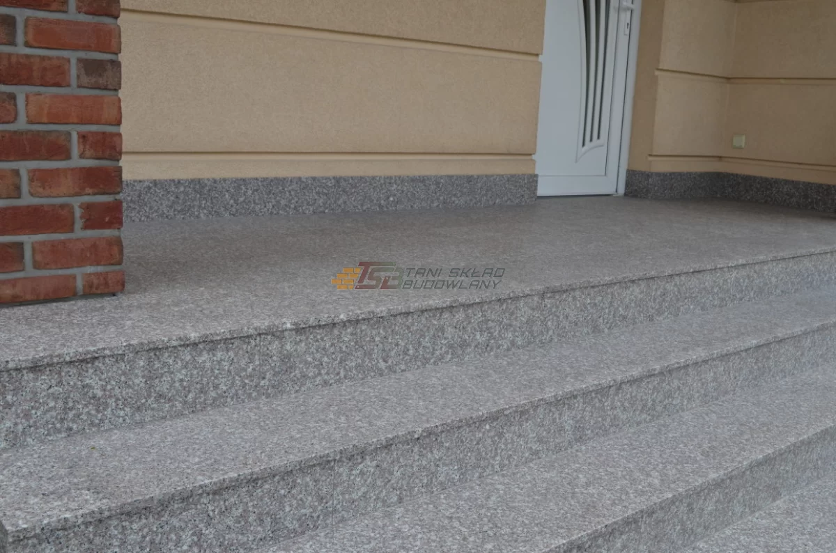 Stopnie z granitu w wykończeniu płomieniowanym w formacie 150x33x2 cm, o chropowatej, ostrej w dotyku powierzchni antypoślizgowej. Idealnej na zewnątrz.
